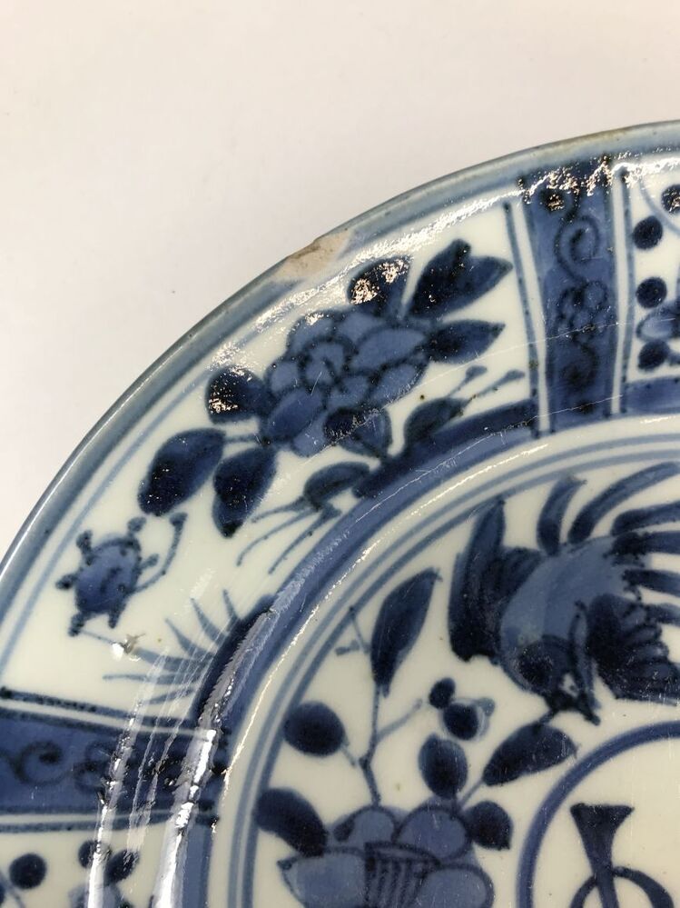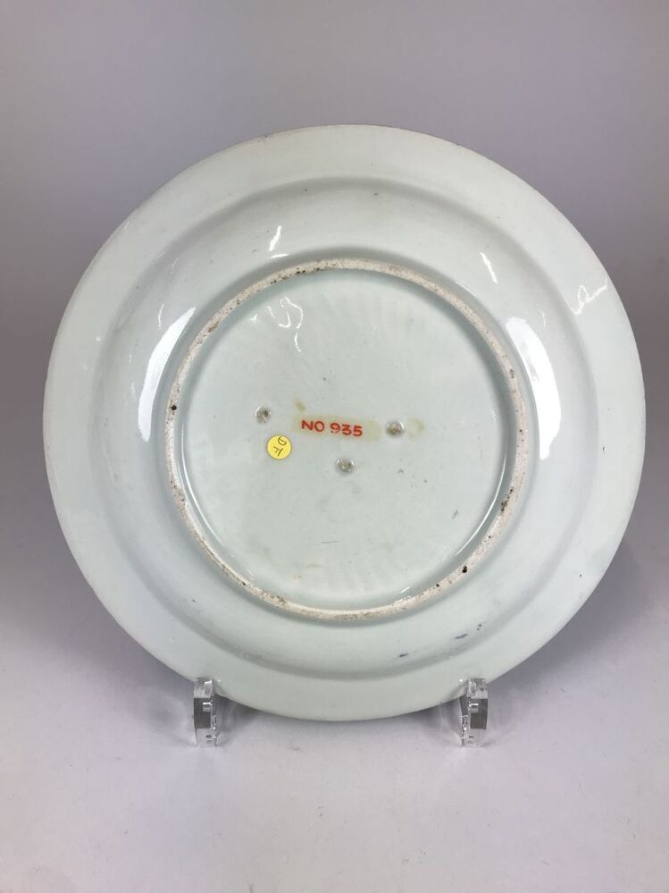 Bord beschilderd in onderglazuur blauw. Op het plat een medaillon met het monogram van de VOC (Verenigde Oostindische Compagnie). Daaromheen twee vogels met bloeiende planten. Op de wand en rand zes radiale brede vakken met om en om gelijke bloeiende planten. Tussen de vakken telkens een radiaal bandje met bloemranken. (Nederlands)