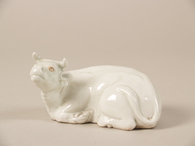 Hol beeld van een liggende koe met een opgeheven kop. Onbeschilderd. De ogen zijn ongeglazuurd. Op de bodem een doorboring.||Japan||Keramiekmuseum Princessehof NO 00936