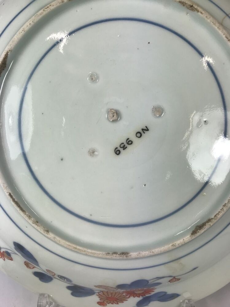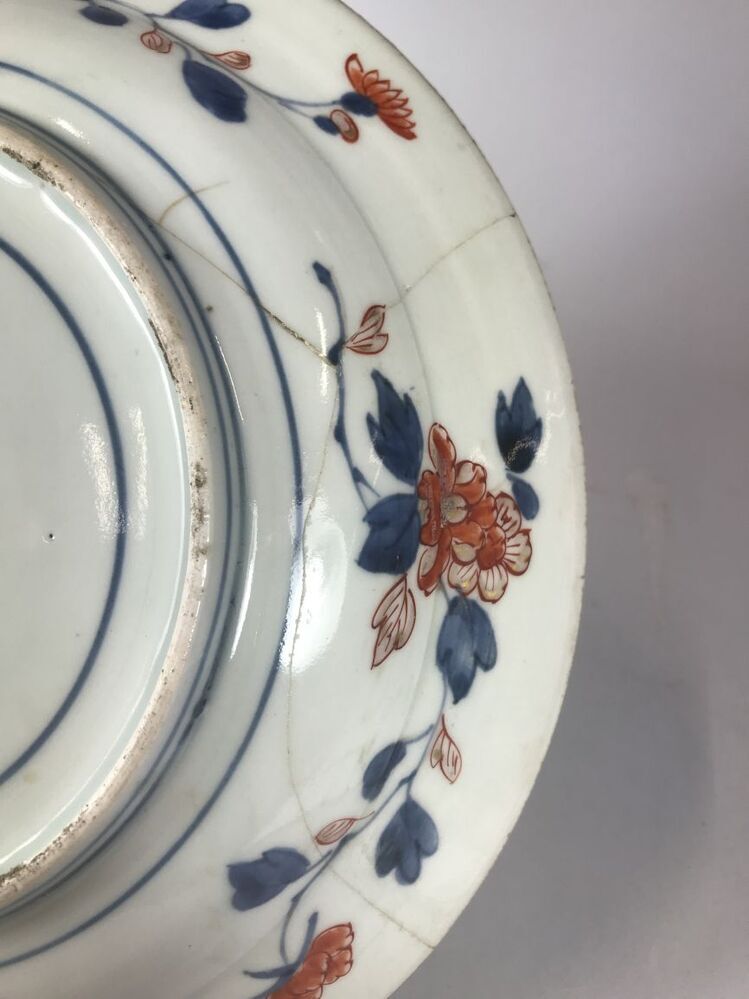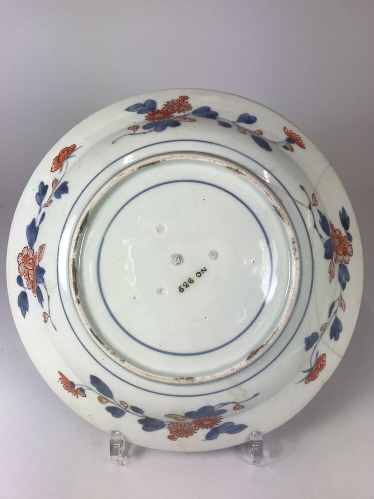 Bord beschilderd in onderglazuur blauw en op het glazuur in ijzerrood en goud. Op het plat een voorstelling van drie vec...loemranken. Op de bodem vier proenafdrukken. Imari.||Japan||Arita||onbekend||onbekend||Keramiekmuseum Princessehof NO 00939
