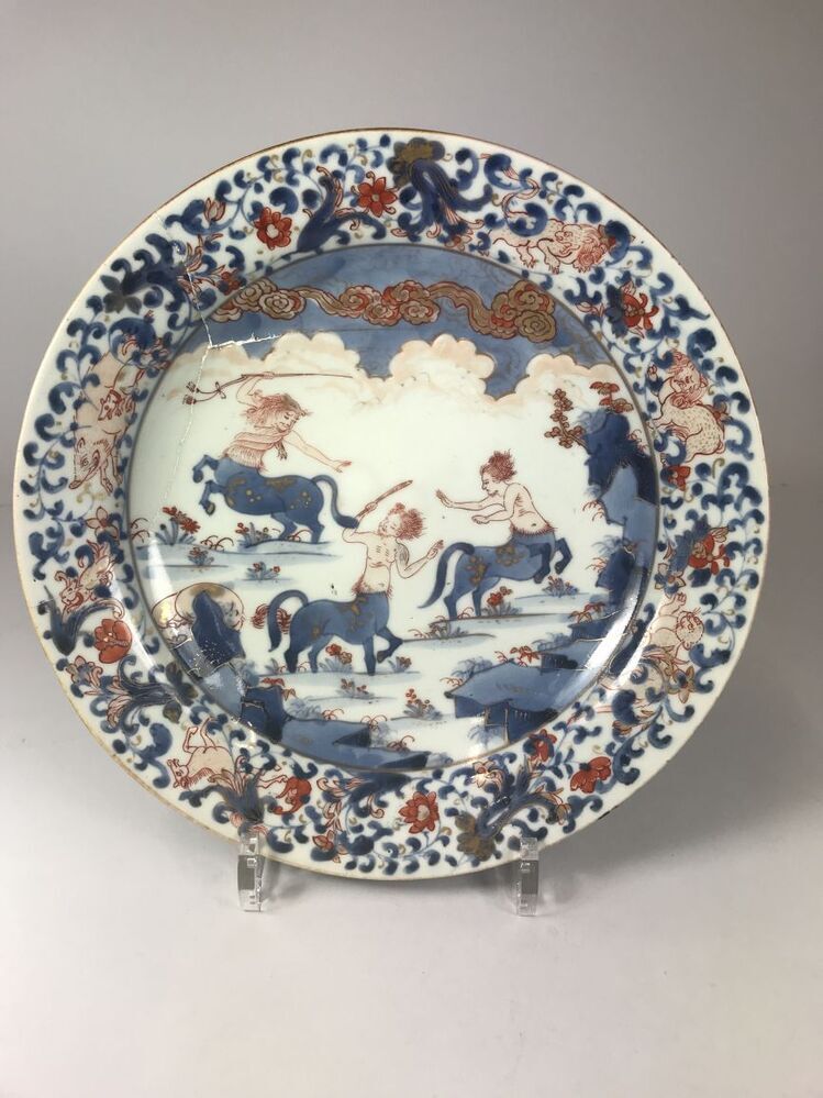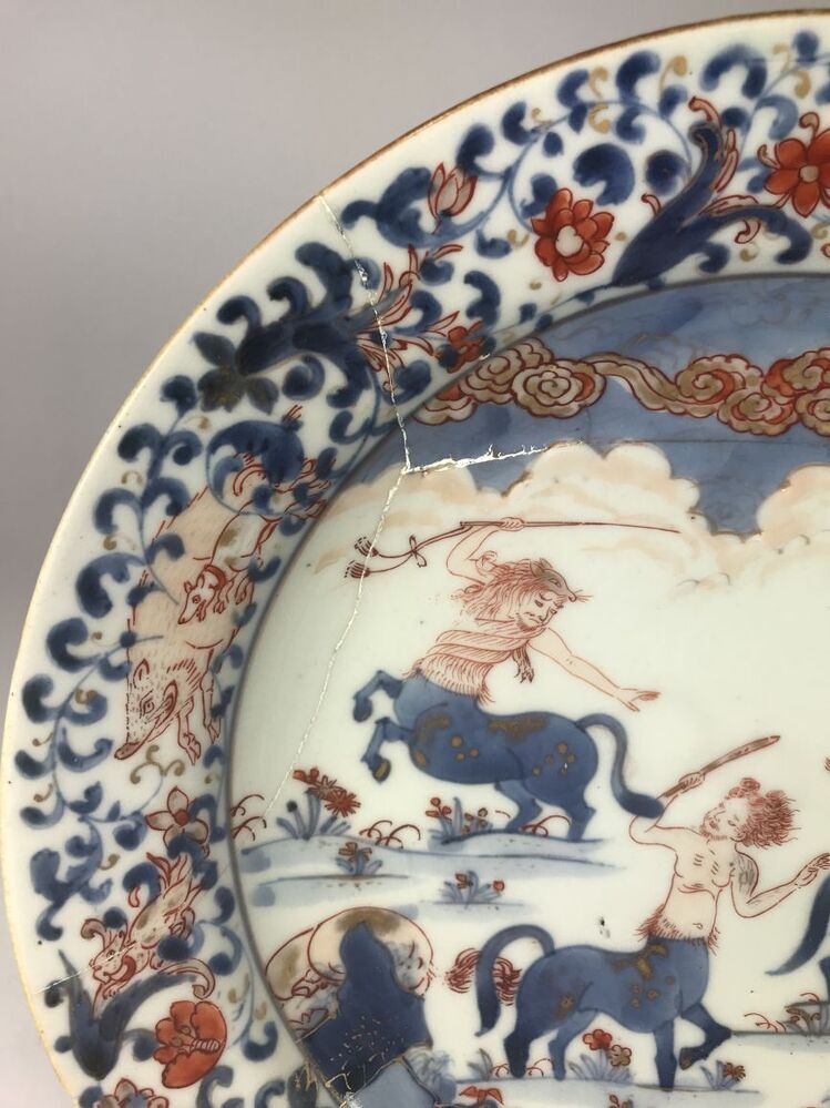 Bord beschilderd in onderglazuur blauw en op het glazuur in ijzerrood en goud. Op het plat een voorstelling van drie vechtende centauren in een rotsachtig-landschap met bloemen. De wand is gedecoreerd met bloemranken en met de klok mee: twee leeuwen, een leeuwin en een zwijn dat achterna wordt gezeten door twee honden. De achterzijde van de wand is gedecoreerd met vier bloeiende bloemranken. Op de bodem vier proenafdrukken. Imari. (Nederlands)