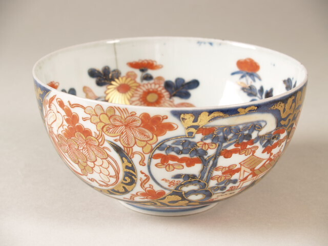 Kom beschilderd in onderglazuur blauw en op het glazuur in rood en goud. De buitenkant is gedecoreerd met vier vakken met daarin een voorstelling van twee gebouwen, een terras en een grote boom. Om de vakken heen zijn bloem- en bladranken te zien. De binnenkant van de kom is gedecoreerd met vier bloeiende takken. Op de bodem een enkele ring. Imari-stijl. (Nederlands)