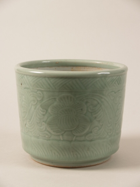 Pot bedekt met groen glazuur en een ingesneden decor van bloemen en bloeiende ranken tussen twee banden met een geometrisch motief. De bodem en voetring zijn ongeglazuurd. Celadon (Nederlands)