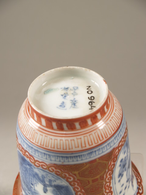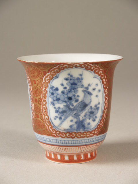 Kop beschilderd in onderglazuur blauw en op het glazuur in rood en goud. Aan de buitenkant drie medaillons op een geometrisch motief met afwisselende voorstellingen; een vogel in een bloeiende prunus, twee figuren met waaiers en een waterlandschap. Op de voetring en onderaan de wand extern drie sierbanden. Op de bodem een zeskaraktermerk. (Nederlands)