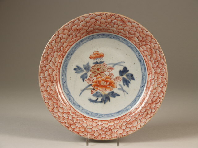 Bord in onderglazuur blauw en op het glazuur in ijzerrood en goud. Op het plat een bloeiende bloemrank (pioen) binnen een band met golvende arcering. De wand is gedecoreerd met een motief van overlappende bloemblaadjes. Imari-palet. (Nederlands)