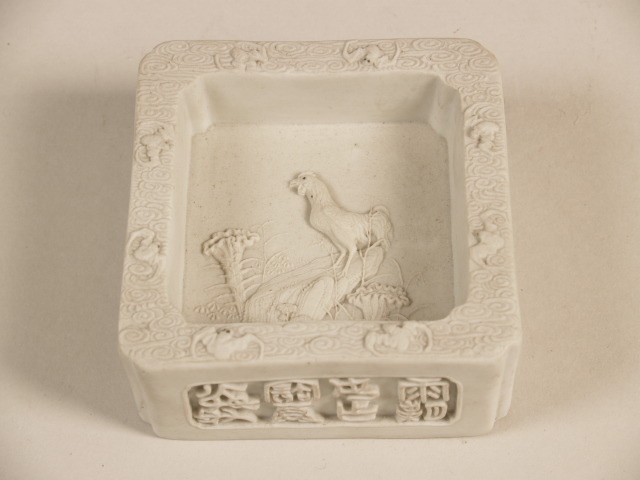 Penselenbak met decor van haan op een rots. Op de rand acht vleermuizen omgeven door wolken en op alle vier de zijden Ch...n stempel van Ma Henghe (馬 衡 和), een laat 19de-eeuwse keramist uit Jingdezhen.||China||Keramiekmuseum Princessehof NO 00975