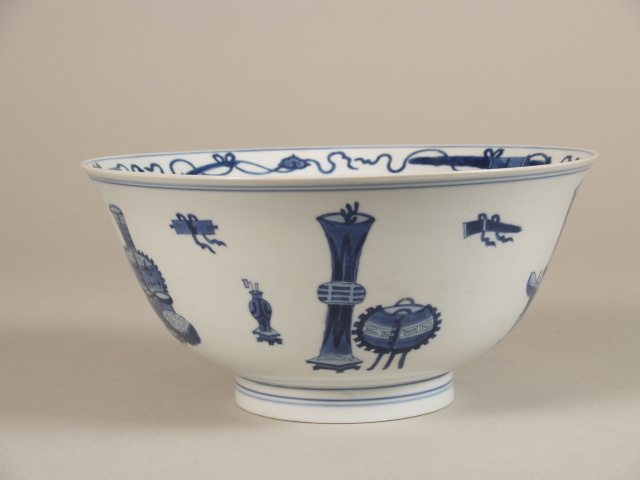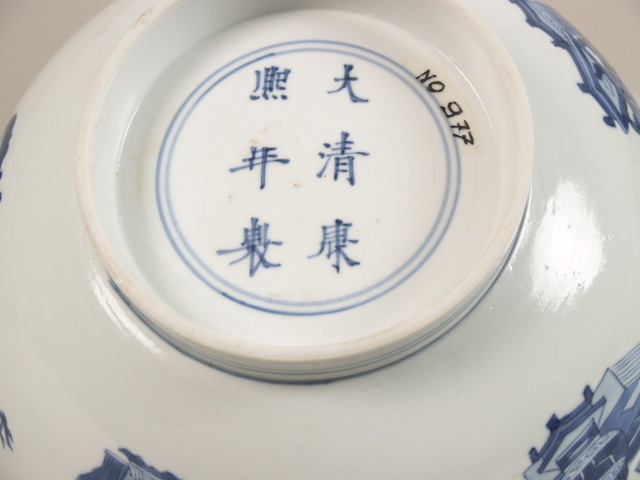 op de bodem in kobaltblauw vertikaal zesmerk Kangzi in dubbele ring (Nederlands)