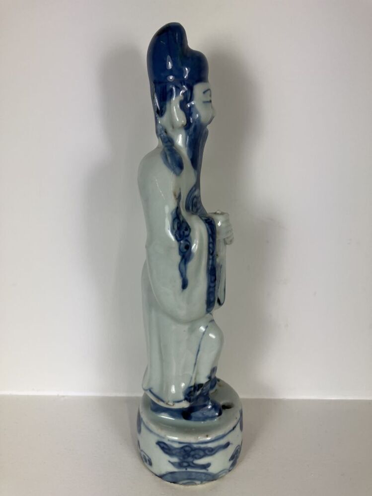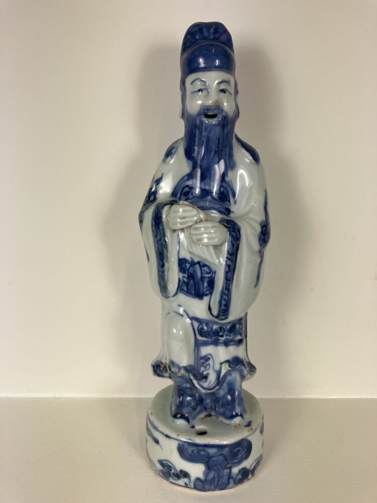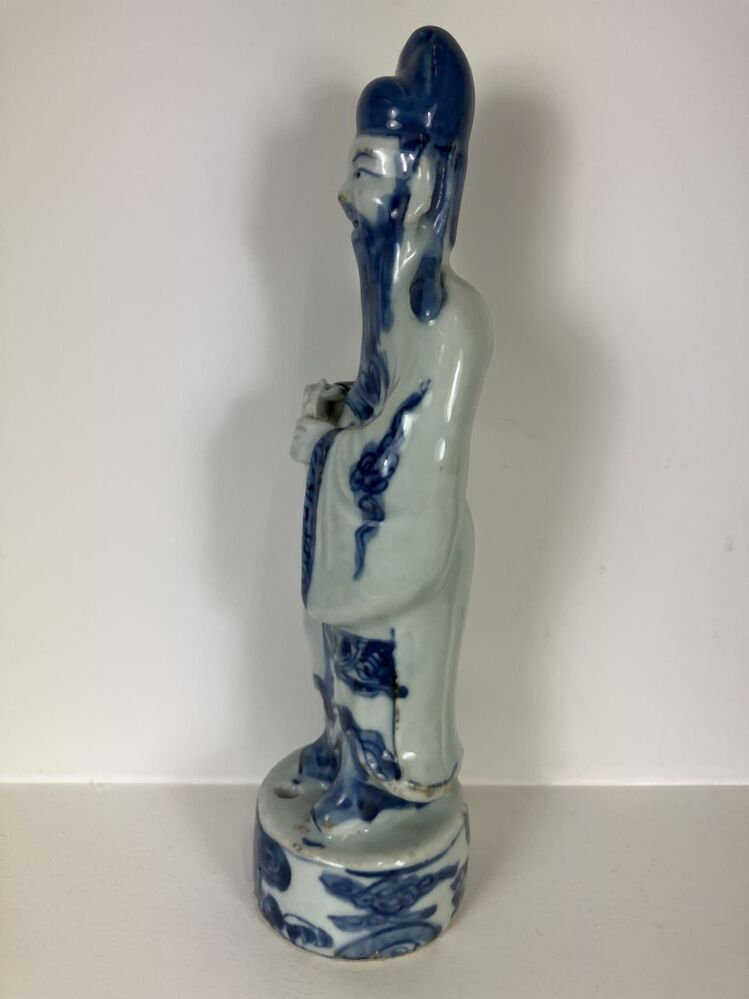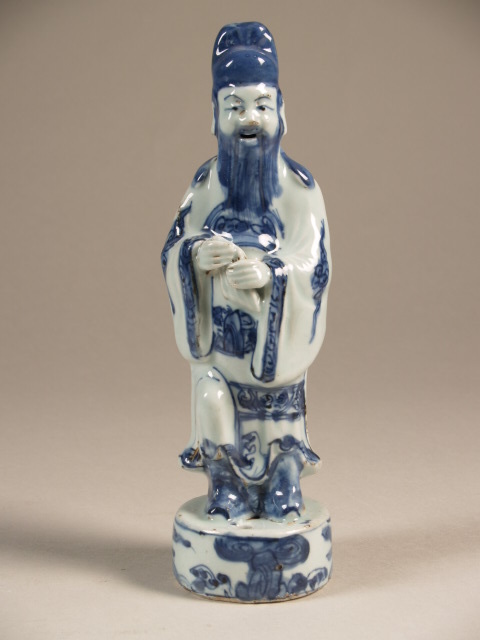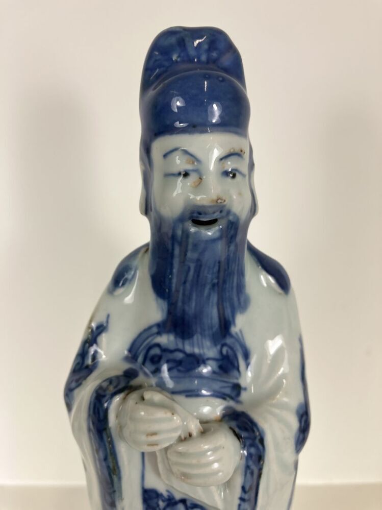 Beeld van porselein in de vorm van een man met open mond, een baard en hoofddeksel staande op een voetstuk, beschilderd in onderglazuur blauw. De man houdt een voorwerp, mogelijk een panfluit, in zijn handen. Mogelijk een voorstelling van een ambtenaar, geleerde of onsterfelijke. (Nederlands)