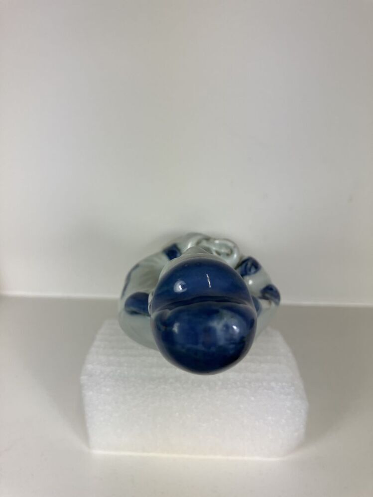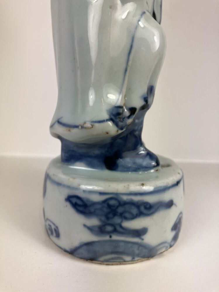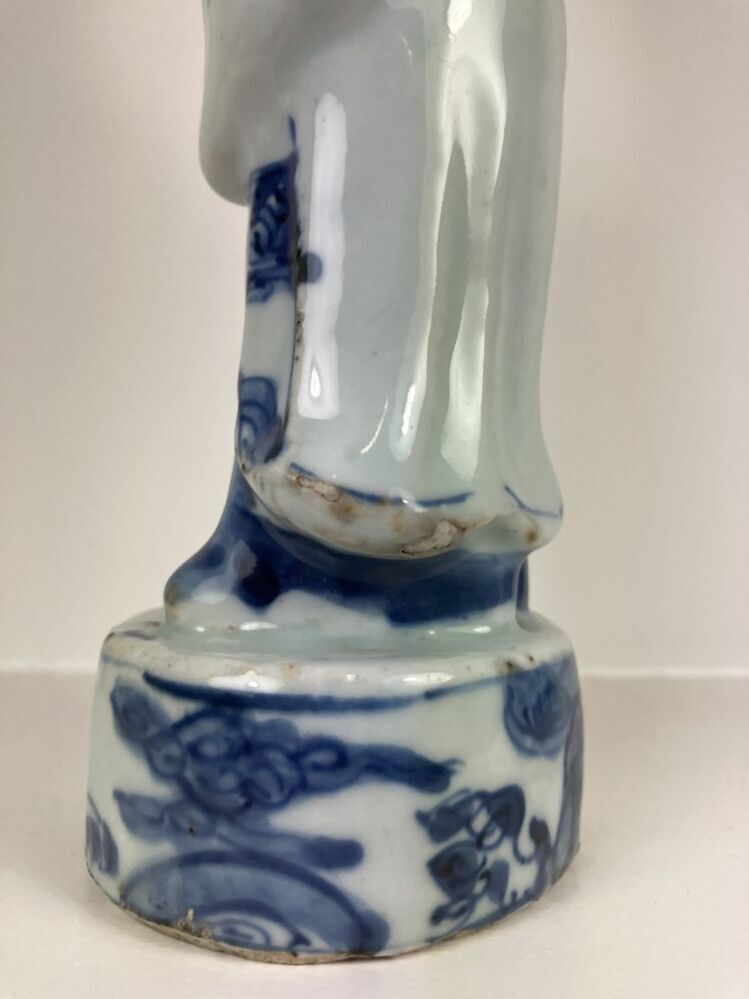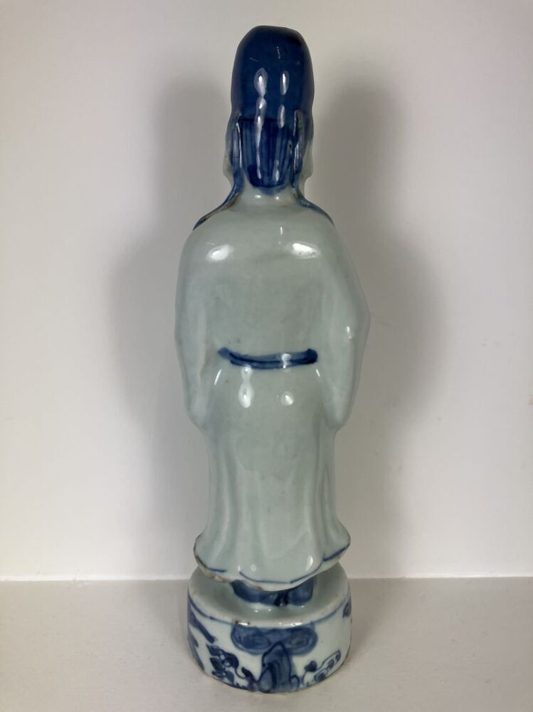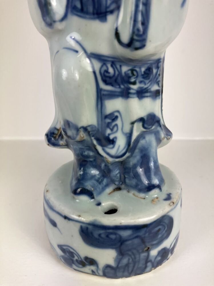 Beeld van porselein in de vorm van een man met open mond, een baard en hoofddeksel staande op een voetstuk, beschilderd in onderglazuur blauw. De man houdt een voorwerp, mogelijk een panfluit, in zijn handen. Mogelijk een voorstelling van een ambtenaar, geleerde of onsterfelijke. (Nederlands)