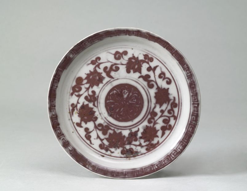 Bord beschilderd in onderglazuur rood met op het plat een decoratie van lotusranken en in het centrum een bloem. Op de r...shmolean Museum, inv. no. EAX.1699 en Art Institute Chigago, inv. no. 1954.476||China||Keramiekmuseum Princessehof NO 00998