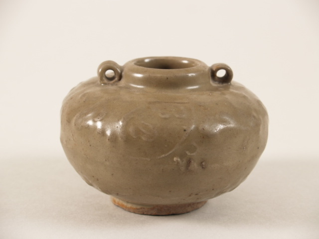 Pot met bruingroen glazuur en twee lussen vastgemaakt aan de mond. Het lichaam is gedecoreerd met bladranken in reliëf. Celadon (Nederlands)