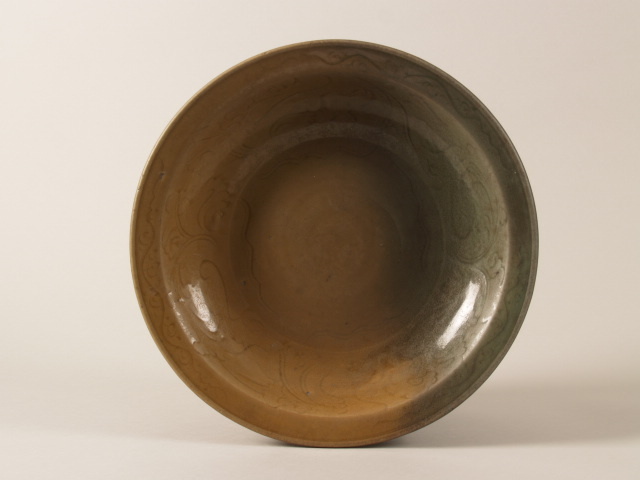 Schotel bedekt met groen glazuur dat gedeeltelijk oranjebruin is uitgeslagen en een ingesneden decoratie. Op het plat vier golflijnen die samen een vierkant vormen. Op de wand bloemranken en op de rand bladranken. Op de bodem een cirkelvormig proenspoor. Celadon (Nederlands)