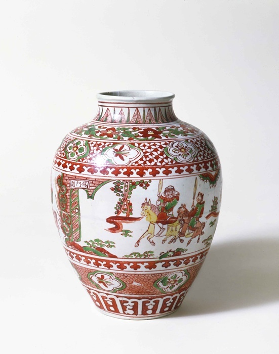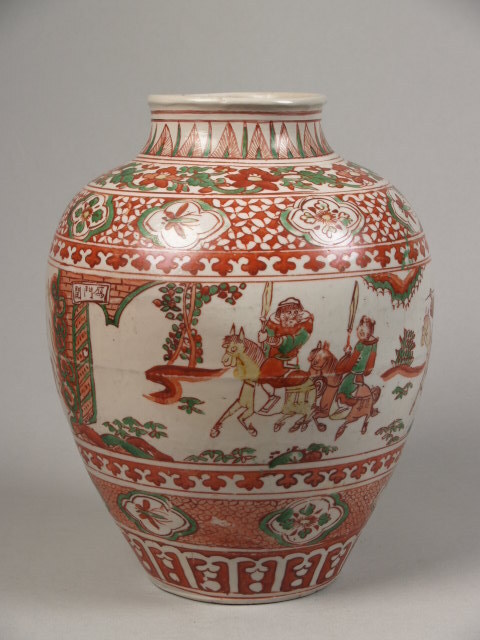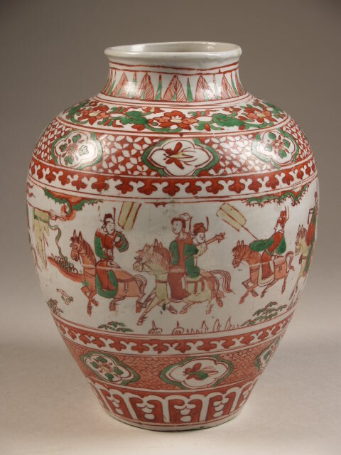 Pot met op de buitenzijde van onder naar boven een decoratie van een zone met godrons, een zone met elkaar oversnijdende cirkels met daarin zeven geschulpte cartouches. In de cartouches om en om een bloem en een insect. Verder een zone met hangend randje, een brede zone met een ruiterstoet (twee krijgers, een vaandrig, een dame, meerdere dienaren met waaier, een oude dignitaris en een officier) die op een open poort af rijdt. Naast de poort wolken waar vier steekwapens uit tevoorschijn komen. Boven de poort een bord met een chinees opschrift: 'ying men guan'. Op de schouder van de pot een zone met hangend randje, een zone met net als onderaan, elkaar oversnijdende cirkels met daarin zeven geschulpte cartouches. In de cartouches om en om een bloem en een insect, een zone met bloem en bladranken en op de hals een staand spitswerk. Op de bodem vlekken van groen email, o.a. om een bakfout te bedekken. De decoratie is uitgevoerd in de emailkleuren ijzerrood, groen en geel. (Nederlands)