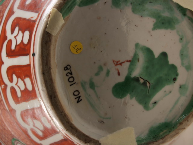 Pot met op de buitenzijde van onder naar boven een decoratie van een zone met godrons, een zone met elkaar oversnijdende...ekken. De decoratie is uitgevoerd in de emailkleuren ijzerrood, groen en geel.||China||Keramiekmuseum Princessehof NO 01028 |
