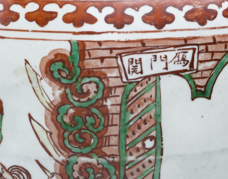 In de bodem gegrift viermerk Jiajing. Boven de poort een bord met een chinees opschrift: 'ying men guan'. (Nederlands)