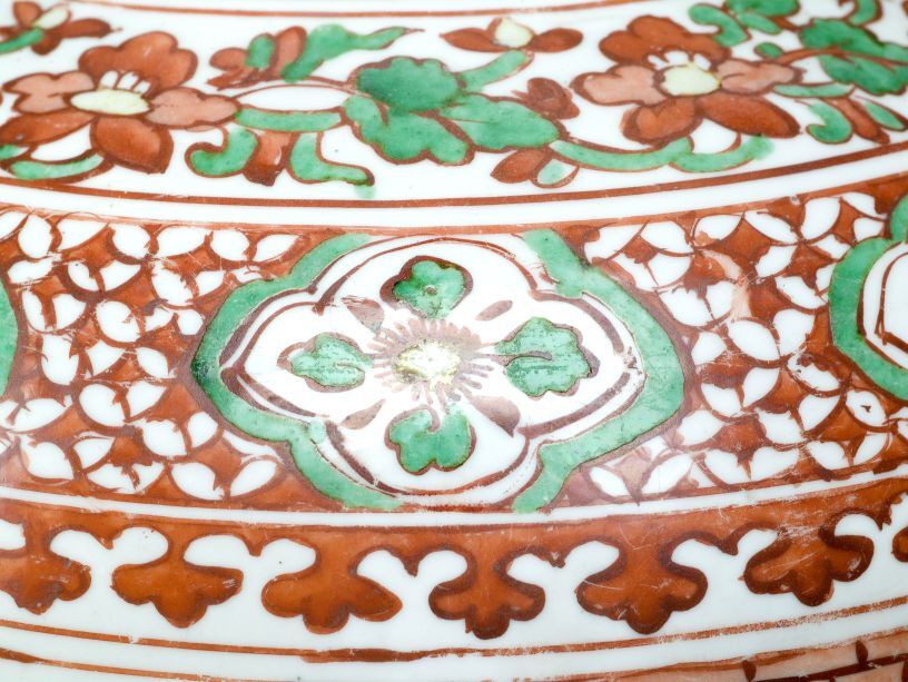 Pot met op de buitenzijde van onder naar boven een decoratie van een zone met godrons, een zone met elkaar oversnijdende...ekken. De decoratie is uitgevoerd in de emailkleuren ijzerrood, groen en geel.||China||Keramiekmuseum Princessehof NO 01028