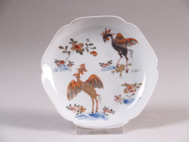 Schoteltje met geschulpte rand en polychroom decor van 2 struisvogels met kikker (Nederlands)