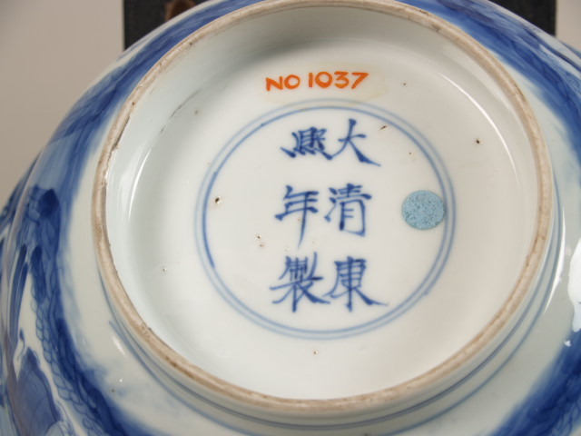 op de bodem in kobaltblauw vertikaal zesmerk Kangxi in dubbele ring (Nederlands)
