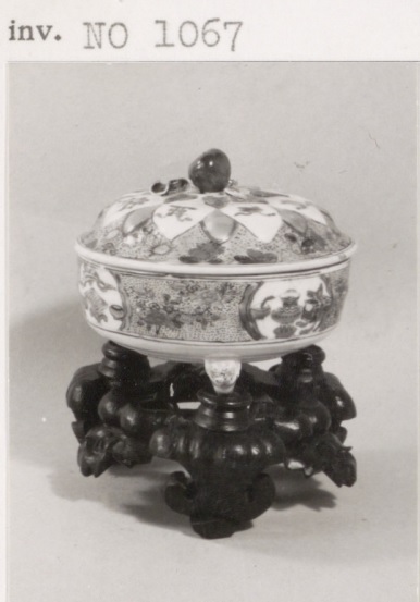 Terrine met deksel en decor van symbolen, famille verte, met voetstuk. (Nederlands)