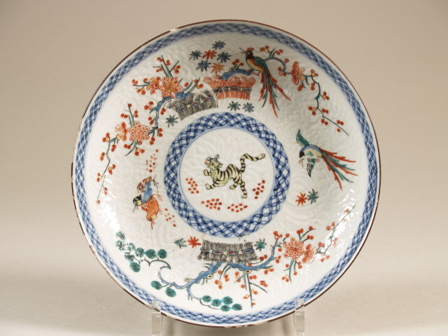Schaal met decor van bloemen, tijger en vogels, in kakiemon-stijl (Nederlands)