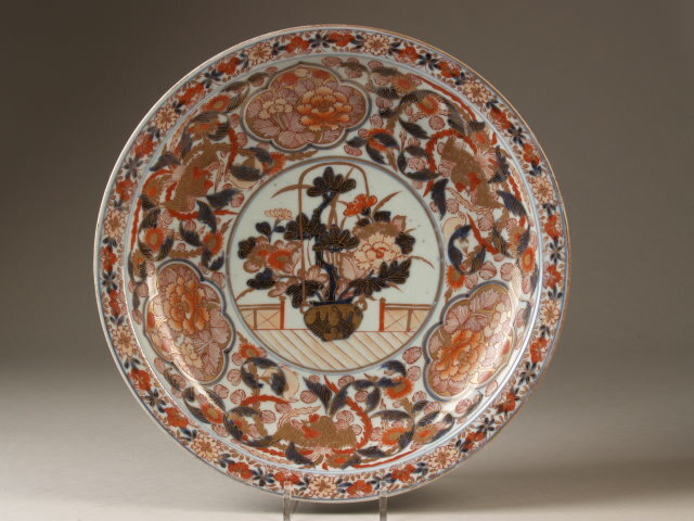 | Nederlands | Schotel met decor van een mand met bloeiende plant op terras, imari |
