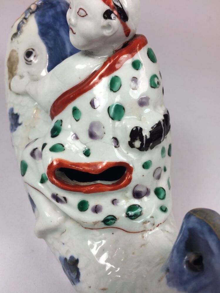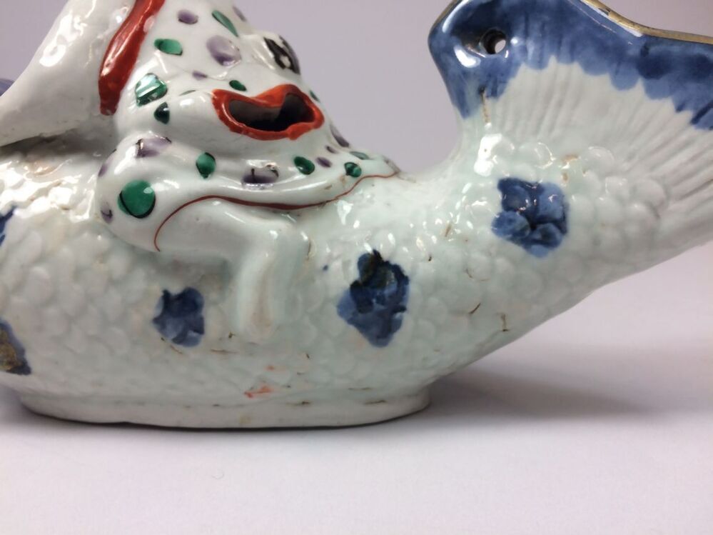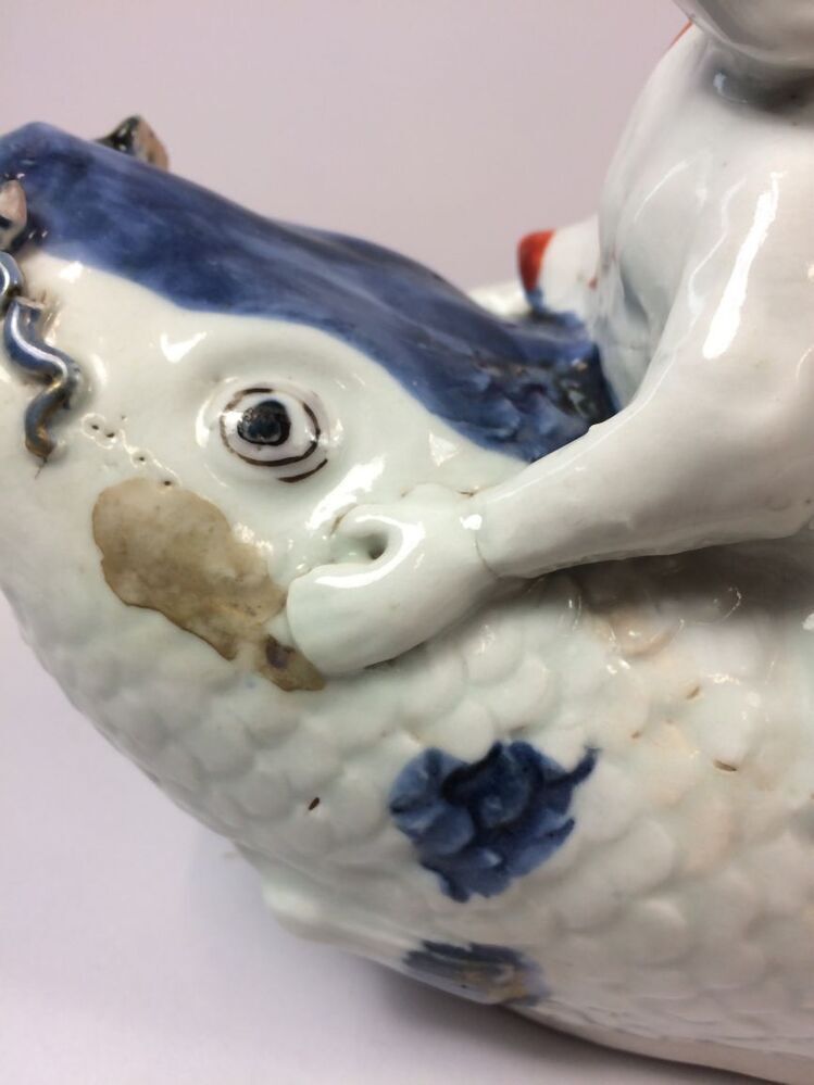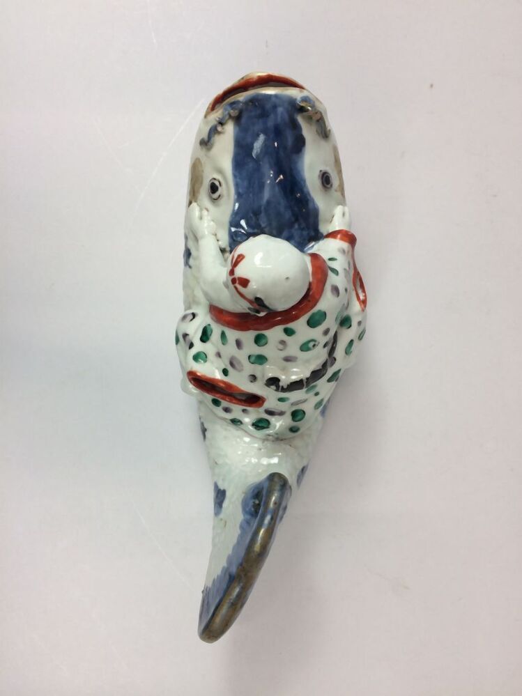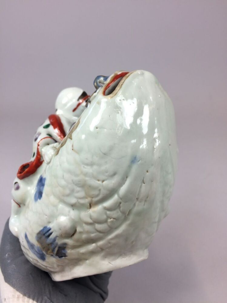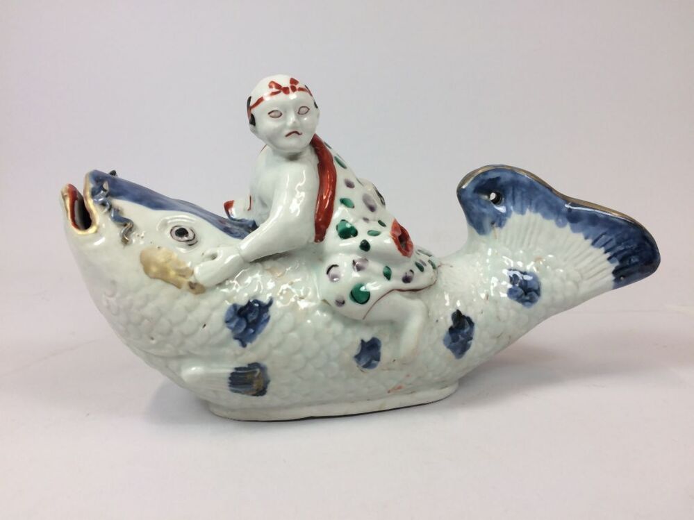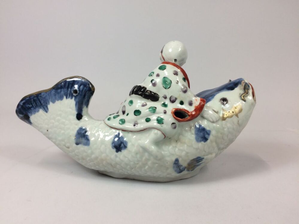 | Nederlands | Vaas in de vorm van een karper met een man op de rug, arita. |