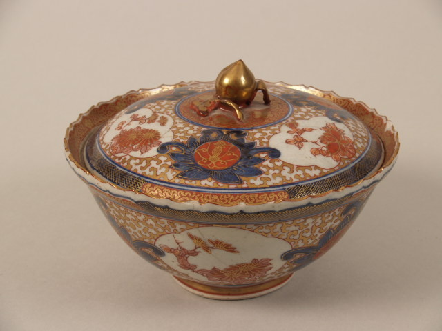| Nederlands | Kom met deksel en decor van cartouches op een ondergrond van krullen, de knop in de vorm van een perzik |