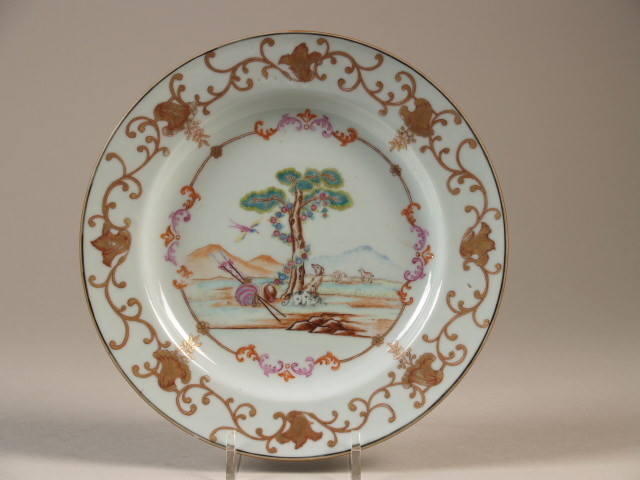 Bord met decor van hond bij boom, chine de commande, famille rose (Nederlands)
