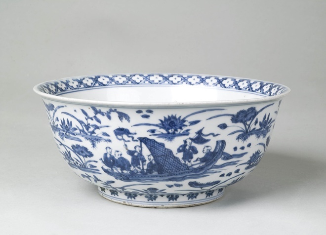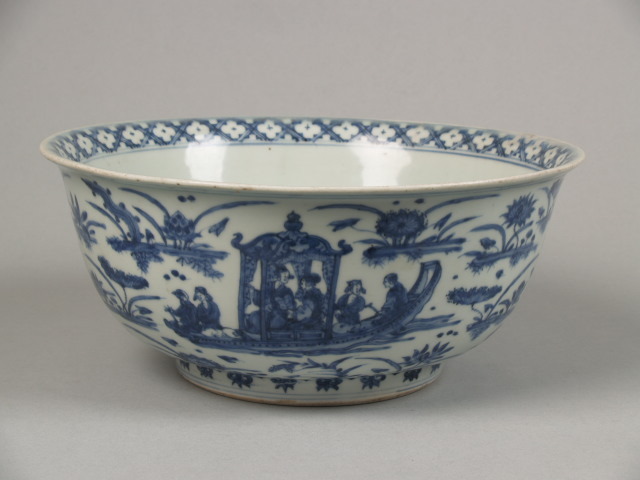 Kom met decor van boot waarop figuren in een lotusvijver (Nederlands)