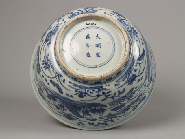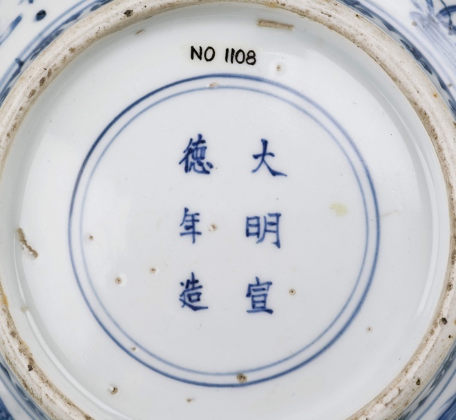 onder op de bodem in kobaltblauw zesmerk Xuande in dubbele ring (Nederlands)