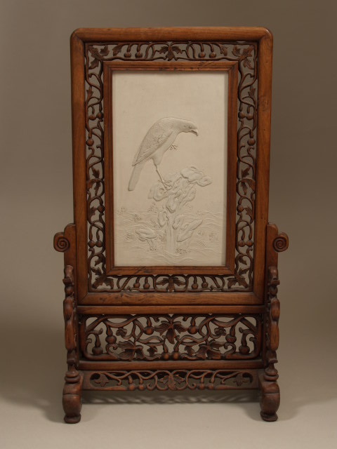 | Nederlands | Tafelstuk, rechthoekig, ongeglazuurde orseleienen tegel in laagreliëf met roofvogel op rots, gemonteerd in houten ajour gesneden scherm |