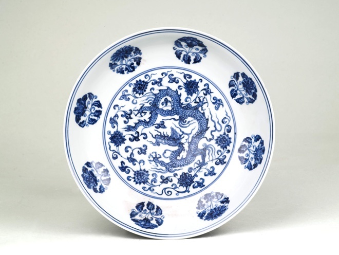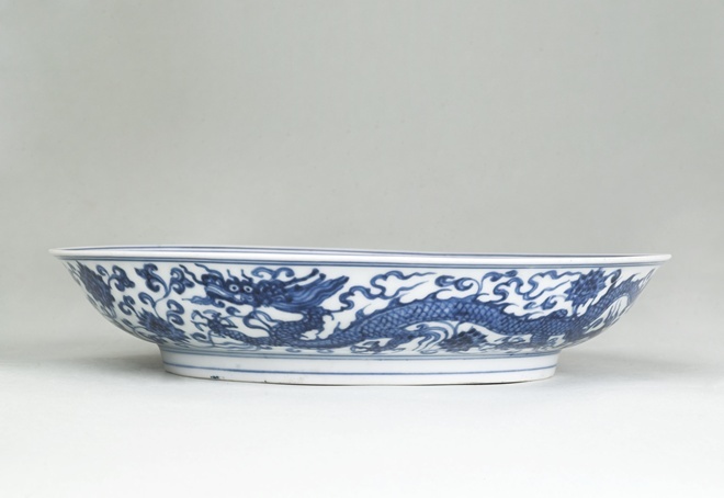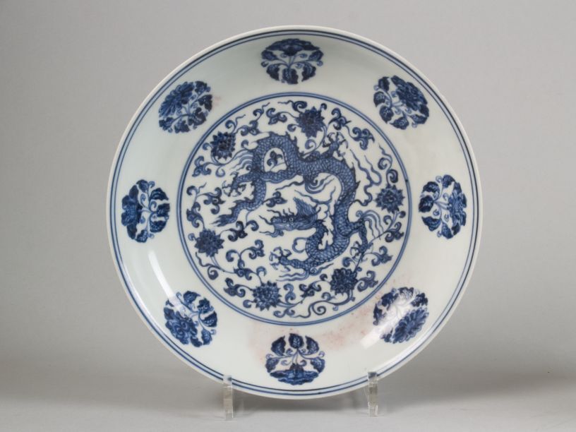 Schaal met op de buitenzijde van de wand twee naar links gaande draken omgeven door bloemen en ranken. Op de binnenzijde op de bodem een vlammende vijftenige draak omgeven door bloemen en ranken. Op de binnenzijde langs de rand acht medaillonvormige bloemen met bladeren. De decoratie is uitgevoerd in onderglazuur blauw, op de bovenzijde vertoond het glazuur lichte koperrode vlekken. (Nederlands)