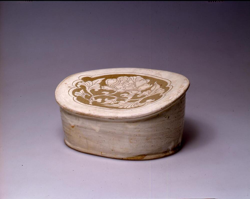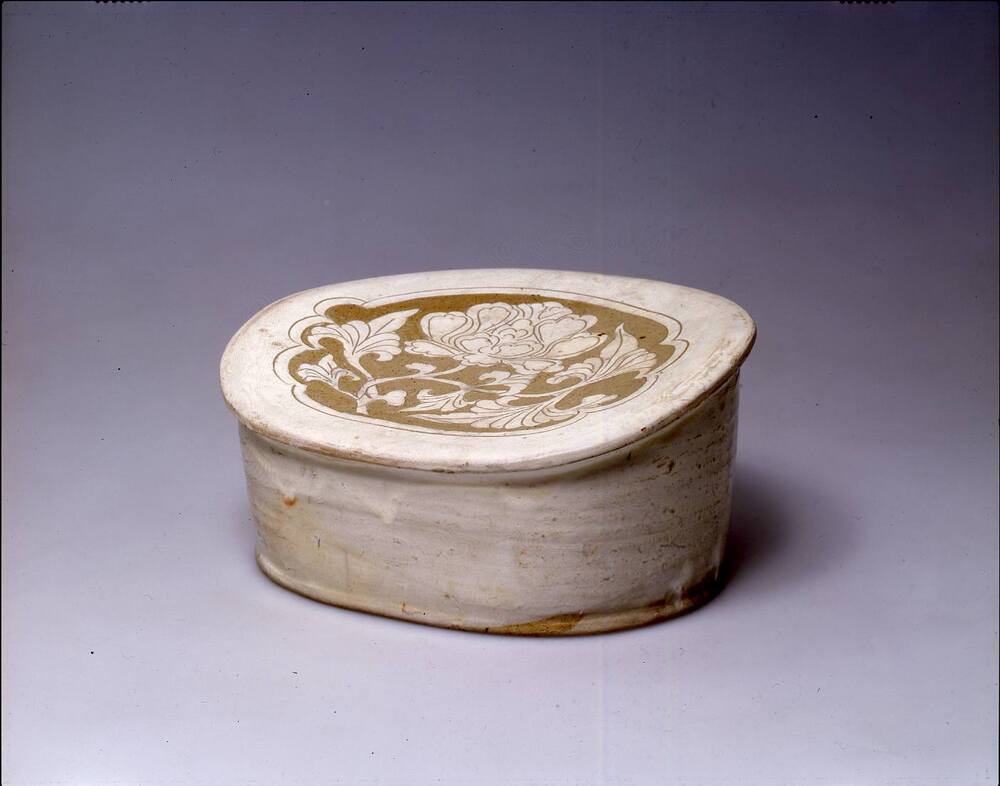 Neksteun van steengoed met ingekrast decor in de vorm van een tak met pioenrozen. Vervaardigd in de sgraffito techniek, waarbij de glazuur om de decoratie heen is weggehaald waardoor de donkere kleur van de klei zichtbaar is. Deze techniek is typerend voor de Cizhou productie, waarbij men zowel donkere als lichte glazuur gebruikte. Dit soort neksteuns werden gemaakt in de noordelijke Cizhou ovens, die bekend stond om de productie van 'local ware'; populaire keramiek voor dagelijks gebruik. Dit soort keramiek wordt meestal aangeduid als 'Cizhou ware' (磁州窯). Deze naam is ontleend aan een gebied in de provincie Hebei waar veel ovens gevestigd waren die deze keramiek produceerden. Ook in omliggende regio's in het noorden werd Cizhou ware gemaakt. Kenmerken zijn de toepassing van slib, zowel voor het aanbrengen van decoraties als om het hele voorwerp mee te bedekken. Dit werd vervolgens meestal bedekt met een kleurloos glazuur, maar soms ook met een kopergroen of turkooise glazuur. (Nederlands)