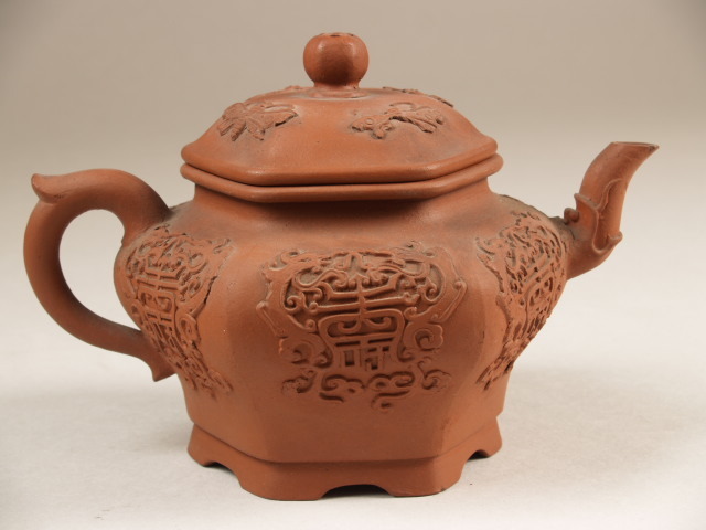 | Nederlands | Theepot met decor in reliëf van karakter Shou en draken |
