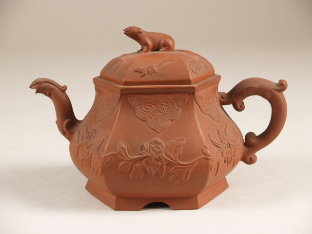 Theepot, zeshoekig, met knop in de vorm van een eekhoorn en decor in reliëf (Q22576)