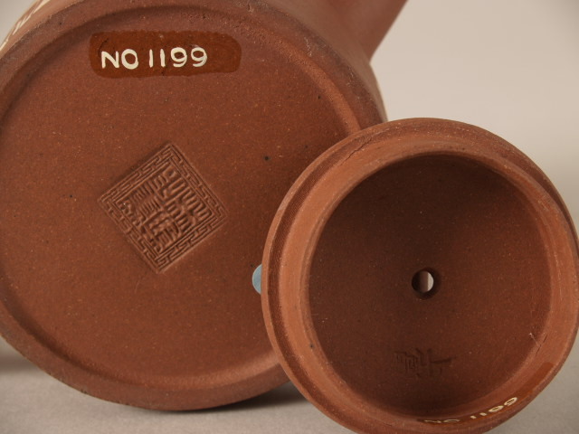 Theepot met decor van bamboe en van rivierlandschap met visser (Nederlands)