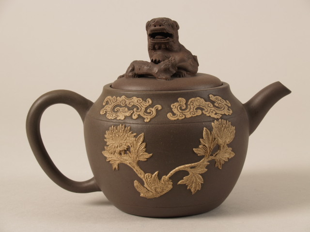 Theepot met decor van bloemen en knop in de vorm van een leeuw (Q22584)