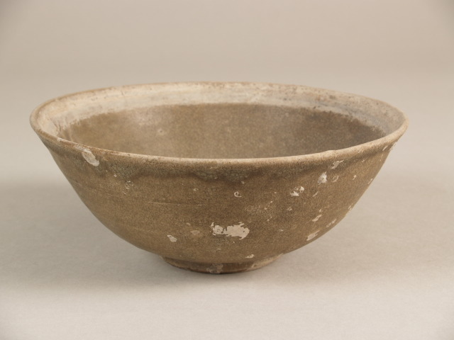Kom met bruingroen glazuur, de liprand aan de binnenkant is ongeglazuurd gelaten. Aan de binnenkant vier vage afdrukken waarop mogelijk een proen heeft gestaan. Celadon Er zitten wat witte (wat lijkt op koraal) resten op kom en het glazuur is dof, dus het is aannemelijk dat de kom lang onder water heeft gelegen en mogelijk is opgedoken uit een scheepswrak. (Nederlands)