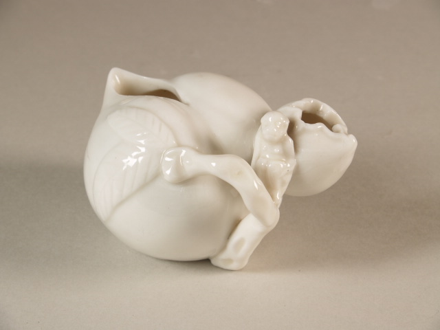 Waterdruppelaar in vorm van perzik met aap. Blanc de chine De combinatie van perzik en aap is een verwijzing naar een eeuwig leven (in het verhaal Journey of the West steelt de aap een perzik uit de tuin van Xiwangmu die hij vervolgens opeet. Hierdoor wordt hij onsterfelijk.). (Nederlands)