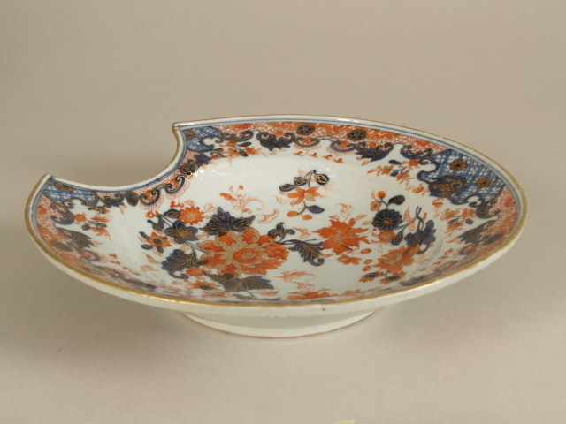 Scheerbekken met aan de bovenzijde centraal een decoratie van grote bloemtakken en op de rand drie symmetrische ornamentstukken. Op de onderzijde een decoratie van drie bloeiende takken. De decoraties zijn uitgevoerd in typische Imari stijl in onderglazuur blauw en rood en vergulde details. (Nederlands)