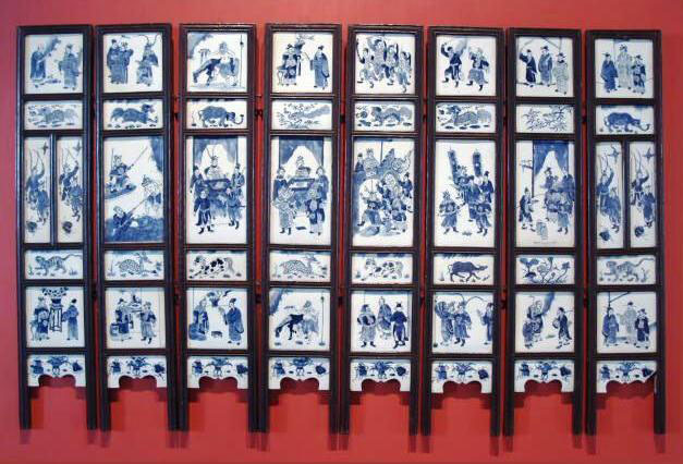 Kamerscherm met tegels waarop decors van mensen, dieren en planten (Nederlands)