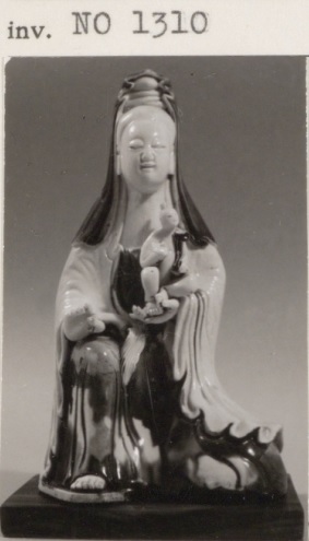 Beeld in vorm van vrouw, Guanyin met kind in haar armen met voetstuk. (Nederlands)