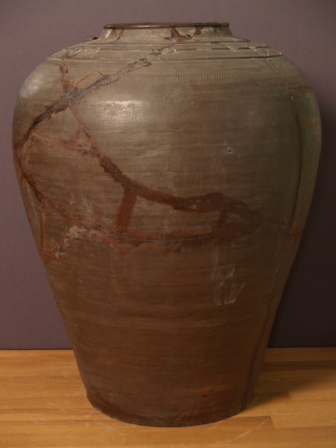 Voorraadpot met decor van richels op schouder en ingekraste motieven op buitenkant (Q22693)