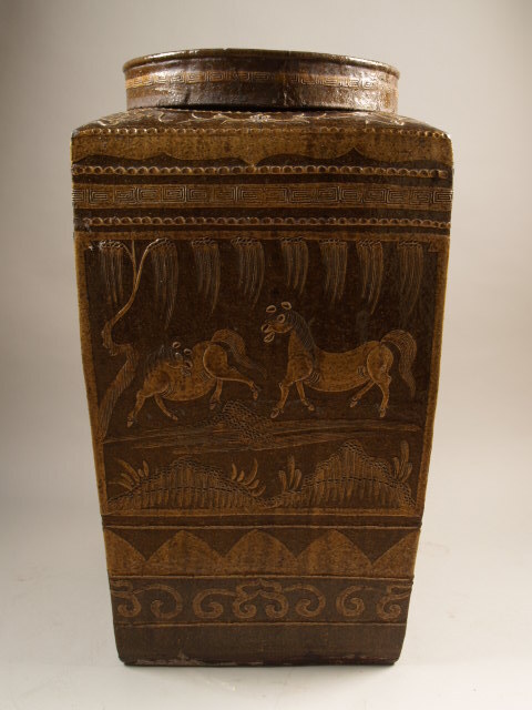 Vierkante pot met deksel met een decor van dieren in een landschap (Q22704)