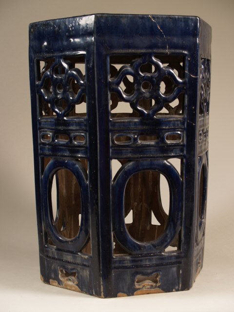 Tuintabourot, zeshoekig, de 6 zijden zijn ajour en in laagreliëf met ovale openingen, monochroom paarsblauw geglazuurd (Nederlands)