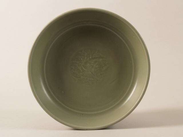 Schotel met groen glazuur en in het plat een decor van een bloem. Celadon||Zhejiang||Keramiekmuseum Princessehof NO 01427 |