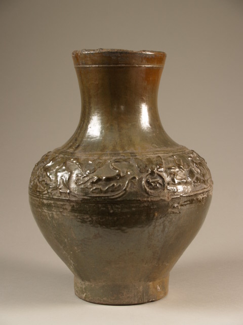 Wijnpot bedekt met groen glazuur en in reliëf decor van jachtscènes in rotslandschap (Q22722)