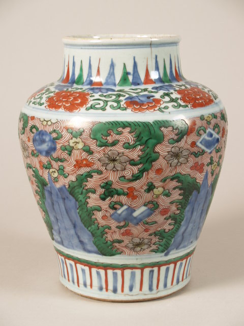 Pot met decor van rotspieken en symbolen op golvende ondergrond, wucai (Nederlands)