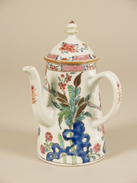 | Nederlands | Koffiepot met deksel en met decor van man die over een muur klimt, opgewacht door 2 meisjes, famille rose |