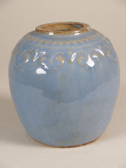 Pot waarvan het deksel ontbreekt met monochroom lichtblauw glazuur. Rond de schouder in reliëf een band van hartvormige bladeren en daarboven een band van driehoekjes.||China||Keramiekmuseum Princessehof NO 01487