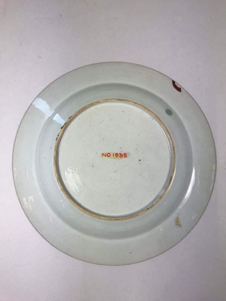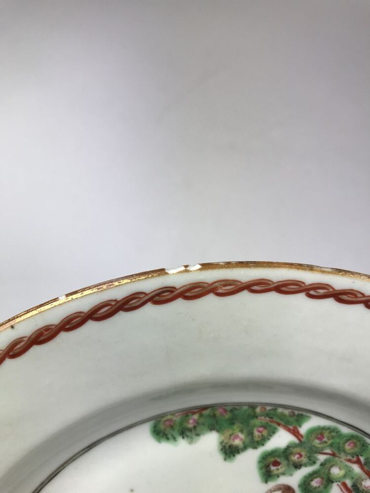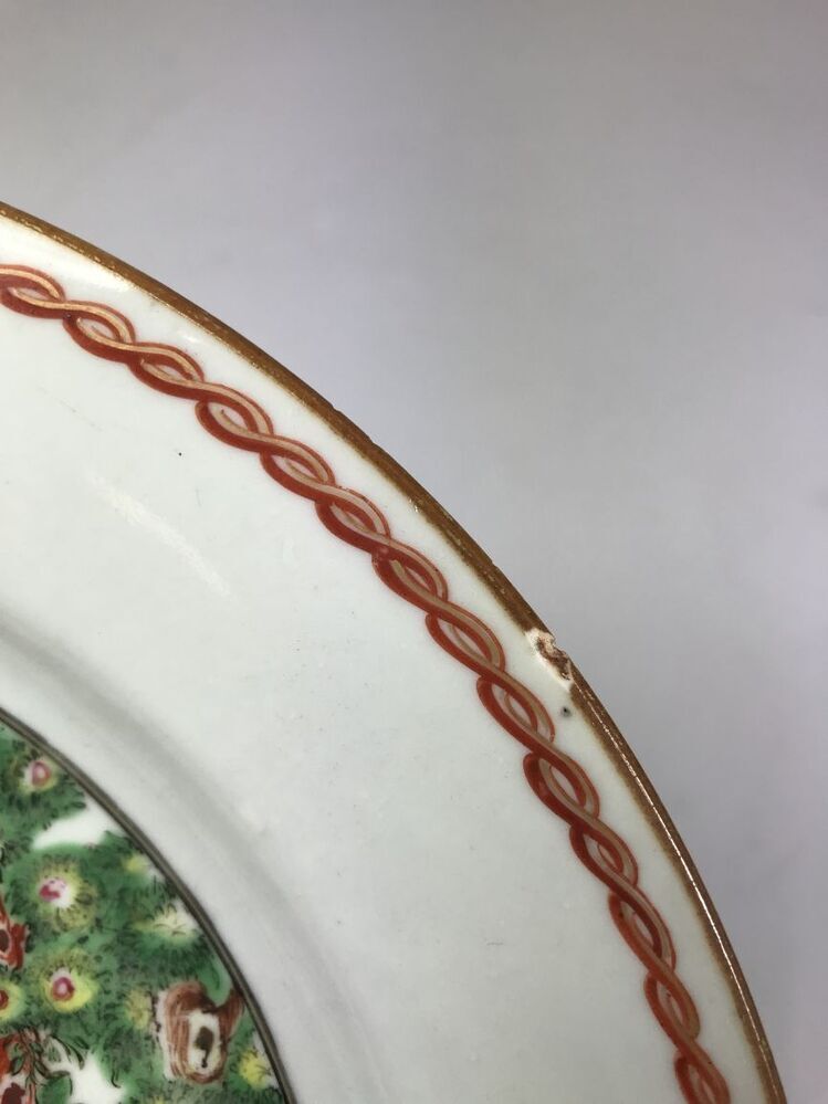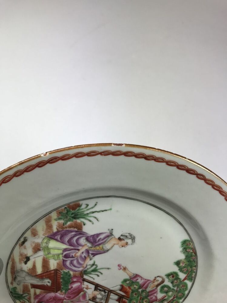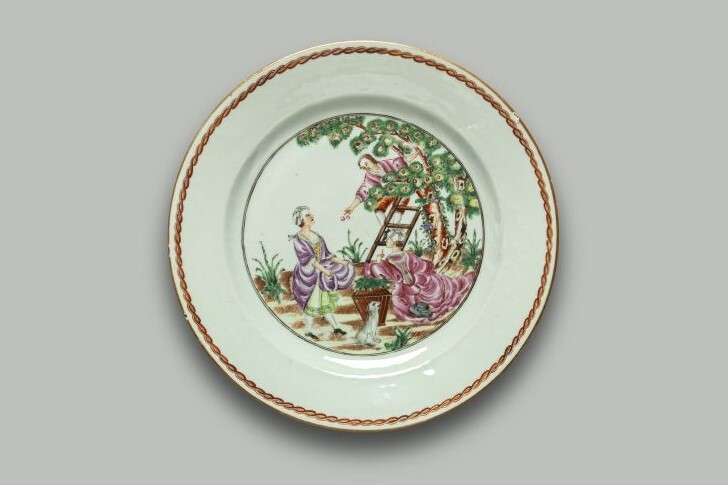 Bord op voetring met spreidende wand en brede platte rand, versierd in diverse emailkleuren. Op het plat is een voorstelling te zien van twee heren en een vrouw in een tuinlandschap. Allen dragen Europese kledij en hebben een westerse haardracht. Links houdt de vrouw haar rok omhoog om appels in op te vangen die een van de heren aan het plukken is van de boom. Rechts van de vrouw zit een jongeman. Op de voorgrond zit een hond. Langs de rand een aaneengeschakeld kettingmotief. Dit bord laat een voorstelling zien die afkomstig is van een Franse prent van Nicolas Ponce (1746-1831) getiteld 'De Appelplukkers'. De prent gaat terug op een schilderij van Antoine Baudoin (1723-1769). In de bestellijsten van de VOC van 1777 werd voor het eerst een bestelling genoemd met de versiering van 'De Appelplukkers'. Dit is een van de weinige Europese versieringen die ook door de VOC besteld is en niet alleen door particulieren. De schepen deden lang over hun reis waardoor de bestelling veel vertraging op liep. (Nederlands)